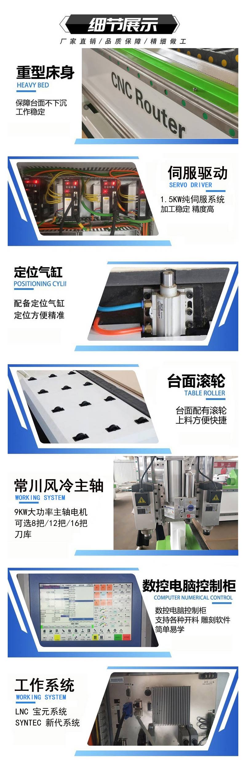 切割頭:意大利HSD切割頭,切削力量大,加工速度快;